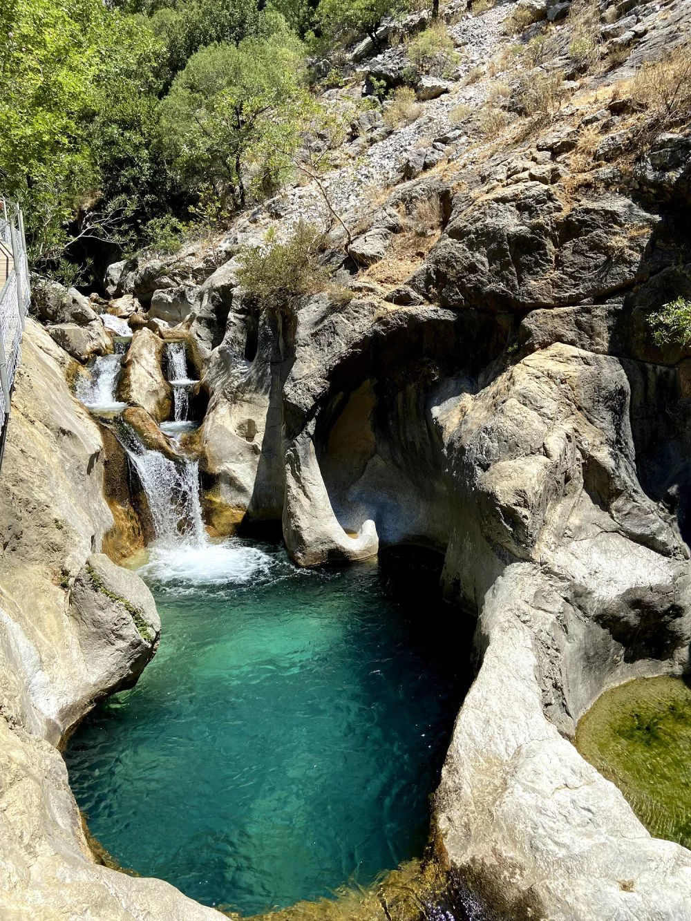 [PARAGRAPH] Along the canyon’s 750-metre trail, over 12 waterfalls greet you. The cascades between the rocks become especially striking towards the end of the canyon. Swimming in the natural pools is possible — the water is ice-cold even in midsummer, which makes it incredibly refreshing on a hot day. Crystal-clear water where you can see the bottom, moss-covered rocks and the sound of the falls — you feel completely disconnected from the city.